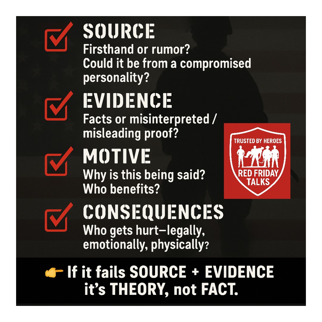 👉 If a claim fails Source + Evidence, or if the “proof” looks distorted, treat it as theory, not fact. Acting without facts risks reputations, relationships, and safety.
